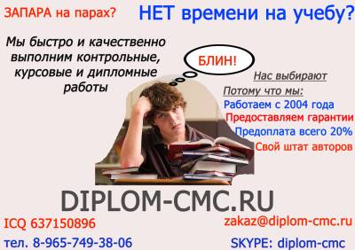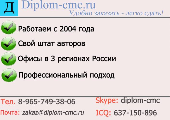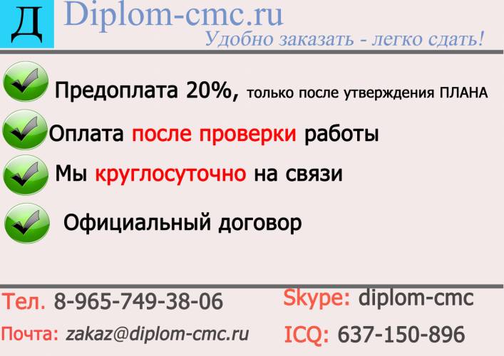 Вы не заказывали консультации* по самостоятельному выполнению дипломных работ, рефератов или курсовых раньше? Не знаете как обезопасить себя? Мы гарантируем высокое качество выполнения заказа на консультацию. Мы на связи большую часть суток (телефон, социальные сети, почта, SKYPE). Размер предоплаты всего 20% и платить ее нужно только после утверждения плана работы, который Вы напишите совершенно самостоятельно*. Окончательно оплачивать работу Вы будете только после того, как она будет готова, и Вы проверите ее. Мы доверяем Вам!